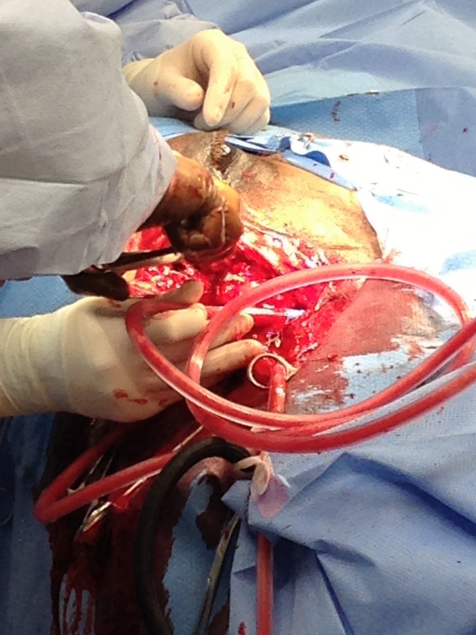 recovery stall and hoisted onto a surgery table. The surgical site is clipped
